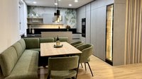 Ein besonderes Highlight bildet die beleuchtete Vitrine mit dunklem Parsolglas, integriert in die Hochschrankgruppe. Sie setzt gezielte Akzente und eignet sich perfekt zur Präsentation edler Gläser oder ausgewählter Geschirrstücke. Die Beleuchtung unterstreicht die Tiefenwirkung und verleiht dem Raum zusätzliche Atmosphäre.