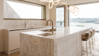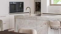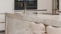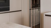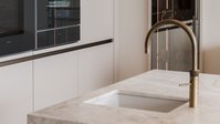 Zwei flächenbündig von unten eingesetzte Spülen mit passenden Armaturen sorgen für eine ruhige, hochwertige Optik und unterstreichen den durchgängigen Designanspruch. Hochgestellt integrierte Elektrogeräte sind ergonomisch in die Hochschrankzeile eingebunden und garantieren maximalen Komfort.