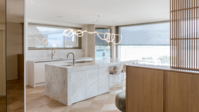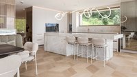 Lichtdurchflutete Inselküche mit integrierter Theke und Glasvitrine .
