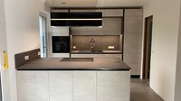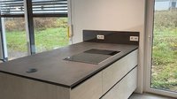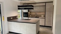 ewe Fachhändler Küchenstudio Möser aus Deutschland hat hier eine sehr kompakte Küche in der Farbe beton opal umgesetzt. Der Vorteil an dieser Betonlook-Oberfläche ist, dass sie sehr hell ist und damit optisch weiterhin offen und locker bleibt. Für Kontrast sorgen die schwarzen Akzente wie zum Beispiel die dunkle Arbeitsplatte, die Griffmulden und die Sockel.