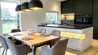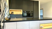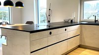 Hier wurde für eine Familie eine einzigartige Küche mit großer L-förmiger Kücheninsel und viel Stauraum umgesetzt. Kombiniert wurden eine ewe Concreto in der hellen und freundlichen betonoptik beton opal und eine ewe nanoo® in granitgrau, die für Kontrast sorgt. Dank deckenhoher Hochschränke wird hier kein Platz vergeudet.