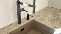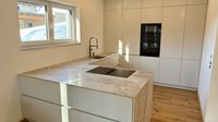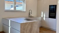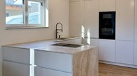 Die Natursteinarbeitsplatte im Dekor Taj Mahal im Leather Look bringt eine dezente, natürliche Struktur ins Spiel und ergänzt das ruhige Gesamtbild auf hochwertige Weise.