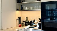 Ein besonderes Highlight ist der Falttürschrank mit integrierter Beleuchtung. Dahinter verbergen sich Kaffeemaschine und weitere Küchengeräte – jederzeit griffbereit, aber bei Bedarf elegant aus dem Blickfeld verschwunden.