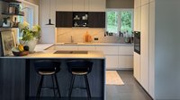 Ein besonderes Highlight ist der Barbereich mit zwei Hockern, der die Insel zum kommunikativen Mittelpunkt macht – ideal für gemeinsame Momente. Abgerundet wird das Konzept durch die durchgehenden, raumhohen Schränke, die viel Stauraum bieten und das Gesamtbild harmonisch vollenden.