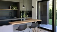 Die Küche kombiniert Funktionalität und Stil: Ein flächenbündig eingebautes Kochfeld, ein hochgestellt eingebauter Backofen und die deckenhoch verbaute Hochschrankzeile sorgen nicht nur für maximalen Komfort, sondern auch für eine clevere Nutzung des vorhandenen Platzes. In der praktischen Nische in der hinteren Küchenzeile, die auch die Spüle integriert, bieten eingebaute Steckdosen zusätzliche Flexibilität für Küchengeräte. Die schwarze Armatur setzt einen modernen Akzent.
