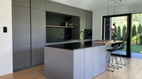 Diese eindrucksvolle ewe Küche im ewe nanoo® Modell besticht durch ihr griffloses Design, das eine klare und moderne Ästhetik schafft. Die eleganten Fronten in basaltgrau harmonieren perfekt mit der Granit-Arbeitsplatte und Rückwand in Nero Assoluto, die durch ihre schlichte, edle Optik überzeugt.