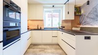 Diese U-förmige ewe nanoo® in beige kombiniert supermatte Oberflächen mit einer markanten Steinarbeitsplatte in Black Nature im edlen Leather Look. Das grifflose Konzept mit Alu-Griffmulden in anthrazitgrau unterstreicht die klare Linienführung und sorgt für eine ruhige, moderne Optik.