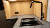 Die flächenbündig eingebaute Spüle und die schwarzen Armaturen harmonieren perfekt mit der Frontfarbe und runden das stilvolle Gesamtbild ab. Die Arbeitsplatte wurde farblich auf die Küchenfront abgestimmt, so dass ein harmonisches Gesamtbild entsteht.