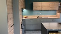 Diese moderne Küche ist ein echtes Statement – elegant, durchdacht und perfekt in den Wohnraum integriert. Die Kombination aus den grauen, supermatten ewe nanoo® Fronten in carbon metallic und der warmen Holzoptik berglärche*, des Modells ewe Sintesa, schafft eine spannende Balance zwischen Klarheit und Behaglichkeit. Die grünen Wände setzen einen frischen, natürlichen Akzent und verleihen dem Raum Charakter.