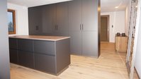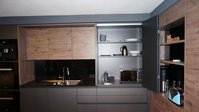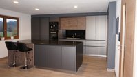 Erleben Sie die Schönheit und Funktionalität dieser ewe nanoo®, die mit ihrem minimalistischen, griff- und nahtlosen Stil in carbon metallic den Inbegriff zeitloser Eleganz darstellt. Diese stilvolle Küche beeindruckt mit klaren Linien und einer praktischen Gerätenische, die in die Hochschränke integriert wurde, um eine aufgeräumte und moderne Optik zu gewährleisten. Möbel im Wohnbereich wurden ebenfalls aus ewe Elementen in derselben Farbe gestaltet, was eine nahtlose Verbindung schafft und den Raum harmonisch wirken lässt.