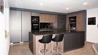 Der integrierte Barbereich mit zwei Barhockern lädt dazu ein, gemütliche Stunden bei einem Drink zu verbringen oder einfach nur zu entspannen. Der Kontrast zwischen den dunklen Küchenfronten und den warmen Holzelementen bringt eine natürliche Note in das Design und verleiht der Küche ein besonders ansprechendes Ambiente.