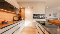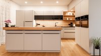 Eine Inselküche bei der eine durchdachte Funktionalität im Vordergrund steht.