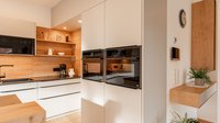 Ein hoch eingebauter Geschirrspüler sowie höher positionierter Backofen und Dampfgarer sorgt dank ergonomischer Planung für bequeme und rückenschonende Bedienbarkeit.