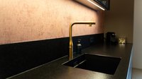 Abgerundet wird das Konzept durch die elegante Kombination aus schwarzer Spüle und goldfarbigem Wasserhahn – ein Detail, das dem reduzierten Gesamtbild Wärme und Charakter verleiht.