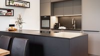 Auf den ersten Blick besticht diese Küche mit der supermatten Oberfläche ewe nanoo®, dank der Fingerabdrücke keine Chance haben. Auf der Insel wurde die Farbe onyxschwarz, auf der Rückseite die Farbe basaltgrau verwendet.