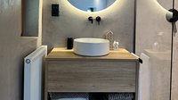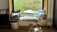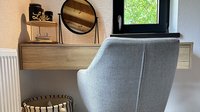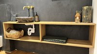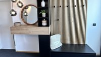 Doch das Konzept endet nicht in der Küche: Auch der Wohnbereich wurde passend gestaltet. Ein elegantes TV-Board und eine gemütliche Sitznische greifen die Materialien und Farben der Küche auf. Abgerundet wird das Gesamtbild durch Regale im Badezimmer, einen maßgefertigten Schreibtisch und eine stimmige Gestaltung im Eingangsbereich.