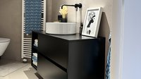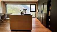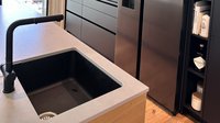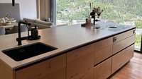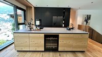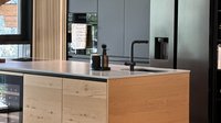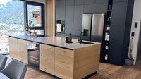 Diese moderne ewe nanoo® in onyxschwarz beeindruckt mit einer klaren Linienführung, grifflosen Fronten und einer ruhigen, edlen Ausstrahlung. In Kombination mit der aus Tischlerarbeit gefertigten Insel aus Asteiche entsteht ein spannender Materialkontrast zwischen kühler Eleganz und natürlicher Wärme.