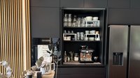 Ein besonderes Highlight dieser Küche ist der elegante Faltschrank. Hinter den Fronten verbirgt sich eine durchdachte Kaffeestation mit großzügigem Stauraum für Gläser, Tassen und Zubehör. Durch das clevere System lässt sich der Bereich bei Bedarf vollständig öffnen, ideal für den täglichen Gebrauch, und ebenso einfach wieder schließen, um eine ruhige, aufgeräumte Gesamtoptik zu schaffen.
