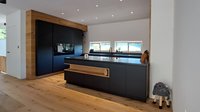 Eine schwarze Küche ist immer ein auffälliges Designelement im Wohnraum. Perfekt kombiniert wird sie hier mit Holzelementen.