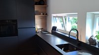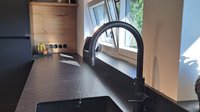 Sehr edel ist auch die schwarze Arbeitsplatte aus Stein, in die die Spüle und die Kochplatte im Unterbau eingebaut wurden. Das bedeutet, es gibt keine Kanten, an denen sich Schmutz ansammeln kann.