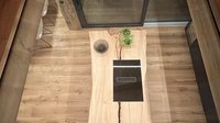 Im ersten Stock wurde eine Glasplatte in den Boden eingesetzt, sodass man von dort aus einen freien Blick hinunter auf die Kücheninsel hat.