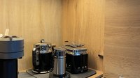 Ein besonders praktisches Stauraum-Feature ist der schöne Falttürschrank, hinter dem große Küchengeräte wie die Kaffeemaschine mit Zubehör einfach verschwinden und dennoch sofort und easy zugänglich sind.