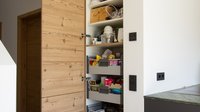 Ein Highlight ist der große versteckte Vorratsschrank. Bei geschlossener Türe würde niemand soviel Stauraum hinter der Wand vermuten.