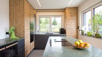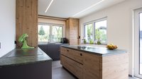 Die Arbeitsplatte aus Stein in Alpengrün veredelt die großzügige Kücheninsel, auf der dank viel Platz ausgiebig gekocht werden kann.