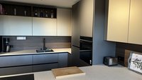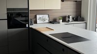 Praktische Details wie ein hochgestellter Backofen, eine schwarze Spüle mit passender Armatur, ein flächenbündig integriertes Kochfeld sowie in die Fronten integrierte Steckdosen sorgen für durchdachte Funktionalität im Alltag – und das bei höchstem Designanspruch.
