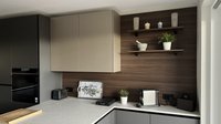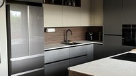 Diese ewe Küche vereint moderne Klarheit mit wohnlicher Wärme – ein stimmiges Zusammenspiel aus ewe nanoo® in gussgrau metallic . sahara metallic und ewe Sintesa in nuss pavia. Das grifflose Design mit Griffmulden verleiht der U-förmigen Küche eine ruhige, elegante Anmutung, während die natürliche Holzoptik der Rückwand und Regale für ein behagliches Ambiente sorgt.