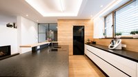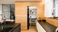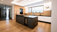ewe Fachhändler Manigatterer Tischler hat hier eine ewe nanoo® mit ihrer reinigungsfreundlichen und supermatten Oberfläche in zwei Farben zu einer großzügig dimensionierten Familienküche kombiniert. Harmonisch wirkt die Kombination mit einem Umfeld und der Thekenplatte aus Eiche. Der in die Kücheninsel integrierte Weinkühlschrank ist besonders praktisch für gemütliche Abende, die gerne an der auf der Insel integrierten Bar verbracht werden. Highlight und Stauraumwunder stellt die Speisekammer dar, die durch eine dunkle Glastür zu betreten ist.