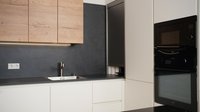 Lebendig wird die Küche durch die Kombination mit Oberschränken in Holzoptik und durch den Kontrast der dunklen Arbeitsplatten. Am rückwärtigen Teil der Küche ist die Arbeitsplatte aus Schichtstoff, auf der Kücheninsel aus Granit, was ihr eine edle Optik verleiht.