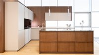 Die Küche kombiniert das Modell ewe Nordic in carameleiche mit dem Modell ewe nanoo® in kieselgrau und schafft so eine harmonische Verbindung aus nordischem Charme und zeitgemäßer Eleganz. Die ewe Nordic Fronten aus nachhaltigem Eichenholz überzeugen durch ihre schlichte Maserung und die klassische Rahmenoptik, die typisch für den skandinavischen Stil ist. Die ewe nanoo® Fronten hingegen bieten eine moderne, erstklassige Haptik mit praktischen Vorteilen wie einem starken Abperleffekt und einer Anti-Fingerprint-Technologie.