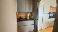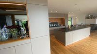 Die Küche verfügt auch über einen Spiegel in grau, einem Vitrinenschrank und einen Weinkühlschrank - nicht nur schön anzusehen, sondern außerordentlich praktisch.