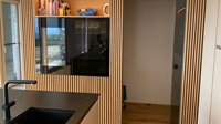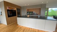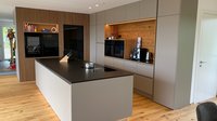 Bei dieser Küche handelt es sich um das Küchenmodell ewe Nuova mit einem Nischenregal, in das unter anderem ein Backofen eingebaut wurde.