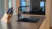 Die besonders gut zu reinigende Arbeitsplatte aus Stein in back pearl passt besonders gut zum Farbton der Küchenfronten - eine sehr ansprechende und moderne Kombination.