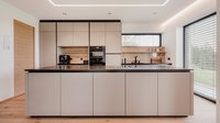 Das Herzstück ist natürlich die große Inselküche, eine ewe Nuova in der sanften Farbe fango. Schwarze Griffleisten, Steckdosen und die edle Steinarbeitsplatte in der Farbe Black Tea geledert kontrastieren die Frontfarbe und schaffen so Hingucker, die sich perfekt einfügen.