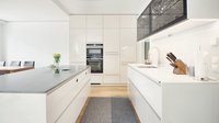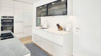 Diese ewe Nuova in panna Hochglanz wurde von ewe Flagship Partner Küchen Design Keglevits umgesetzt. Panna hat einen cremefarbenen Unterton, der beinahe aussieht wie weiß, aber wärmer wirkt. Kontrastreich dazu wirken die Oberschränke mit dunklem Parsolglas und schwarzen Aluminiumrahmen, die Gläser edel in Szene setzen. An der Unterkante der Oberschränke befindet sich eine LED-Leiste, die ideales Arbeitslicht für die Arbeitsfläche bietet.