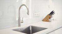 Die Arbeitsplatten sind aus Granit in der Farbe atlantis auf der Kücheninsel sowie aus weißem Corian auf der Küchenzeile. Der Wasserhahn ist ein Quooker®, der kaltes, heißes und Sodawasser bereitsstellt.