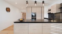 Schwarze Akzente ziehen sich durch die gesamte Küche, ergänzt durch integrierte LED-Leisten bei den Oberschränken sowie weitere Lichtbalken und Deckenspots, die eine warme, einladende Beleuchtung bieten. Ein eingebauter Dampfgarer, Backofen (hochgestellt eingebaut) und Kühlschrank runden die moderne Ausstattung ab.