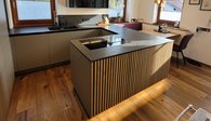 Moderne Eleganz trifft wohnliche Natürlichkeit - diese Referenzküche setzt auf griffloses Design in taupe*, kombiniert mit Eiche-Altholz-Akustikpaneelen. Die Naturstein-Arbeitsplatte und Rückwand in Coffee Brown bringt Tiefe und Charakter, während schwarze Details – von den Griffmulden bis hin zur Spüle und Armatur – für ein edles, zeitloses Gesamtbild sorgen.