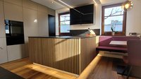 Besonders praktisch ist die versteckte Speis dieser ewe Nuova hinter den Hochschränken, die integrierte Essgruppe für ein gemütliches Beisammensein und die durchdachte Beleuchtung, die die Materialien perfekt in Szene setzt.