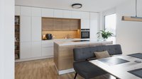 Diese Inselküche besticht durch die elegante Kombination aus weißen Fronten und Eichenholz-Elementen.