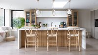 Die Inselküche ist eine ewe Nuova in den Farben weiß und fango und wurde ergänzt mit Eichenelementen aus der hauseigenen Tischlerei von ewe Fachhändler Searle & Taylor. Sie ist schlicht und dennoch eindrucksvoll schön.
