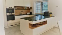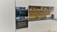 Dank der ergonomisch hochgestellten Elektrogeräte wird die Küchenarbeit zum Vergnügen, während graue Armaturen einen dezenten, modernen Akzent setzen. Herdplatte und Spülbecken sind flächenbündig in die Arbeitsplatte eingebaut und sorgen so für ein aufgeräumtes und elegantes Gesamtbild. In den integrierten Wandregalen finden sowohl Küchengeräte als auch Dekoration ihren Platz.