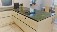Mit dieser ewe Nuova erleben Sie die perfekte Verbindung von modernem Design und durchdachter Funktionalität. Die grifflose Küche beeindruckt durch klare Linien und eine harmonische Kombination von weißen Küchenfronten mit warmen Holzelementen in eiche. Die Arbeitsplatte aus Stein in einem satten Alpengrün bringt frische Farbe in den Raum und sorgt für eine natürliche Note.