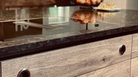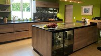 Besonderheiten dieser Küche sind die Arbeitsplatte aus Stein in der Farbe Brown Antique Leather sowie die riesige Kücheninsel mit einer Thekenplatte aus Altholz Eiche, wo es sich gemütlich gemeinsam essen lässt.