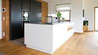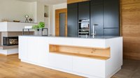 Diese von ewe Flagship Partner BAM.wohnen umgesetzte Inselküche beeindruckt mit ihrer großen Kücheninsel in weiß matt lackiert, die durch eine holzverkleidete Nische aufgelockert wird. An der Rückseite befinden sich in die Wand eingebaute Hochschränke in anthrazit, die von einer harmonischen Holzumrahmung begleitet werden.