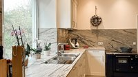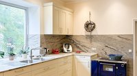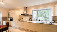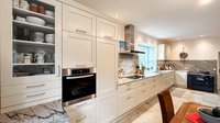Die FM Hirschalm ist eine Küche aus edlem Holzfurnier mit Rahmenfronten, die den typischen Landhausstil ausmachen. Hier wurde für eine Familie dieses schöne Küchenmodell in einer L-förmigen Küche umgesetzt, die mit ihrer langen Küchenzeile und der eleganten Arbeitsplatte aus Stein in praha gold begeistert.