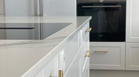 Ein Küchenstil, der bei uns eher selten zu finden ist - in diesem imponiert diese tolle Echtholzküche, Modell FM Keltensteig. Die Fronten wurden weiß matt lackiert und mit goldfarbenen Griffen versehen, weitere goldene Akzente komplettieren den edlen Look.